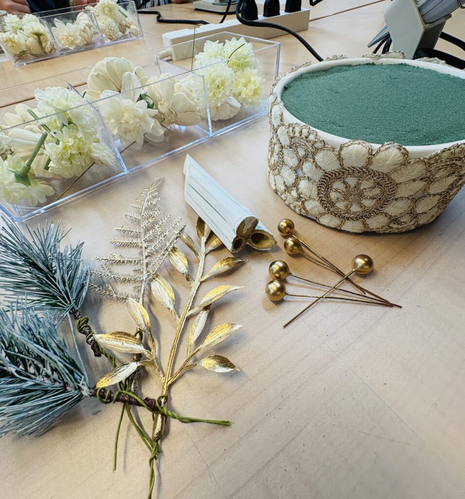 おしゃれなインド刺繍リボンが巻いてある陶器の中のスポンジにバランス良くお花や飾りをさしていき、いい感じでデザインが決まったらグルーガンでつけます。