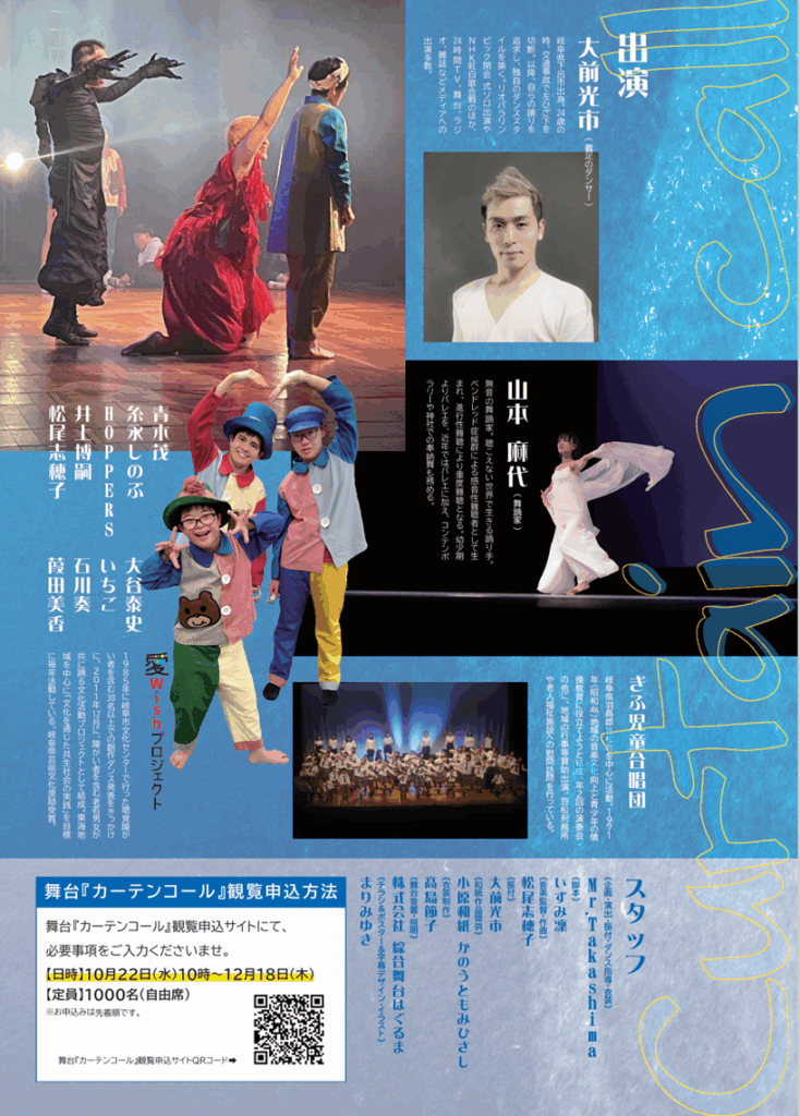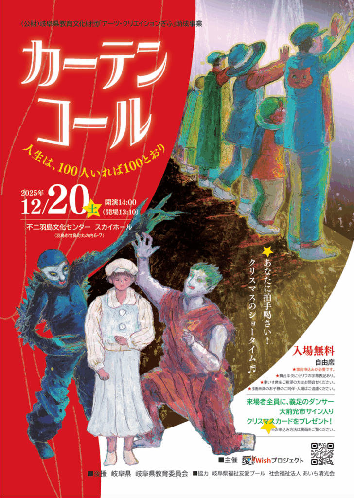 息子と一緒に参加してる、愛Wishプロジェクトで、12月20日 不二羽島文化センターで、舞台「カーテンコール」を公演します。この舞台は、障がい者含む老若男女が、楽器やダンスを駆使したインクルーシブな舞台、障がい者やLGBTQを中心とした人権問題にも挑みながら、愛と共生をテーマにエネルギッシュで幸せ空間を目指す舞台です。