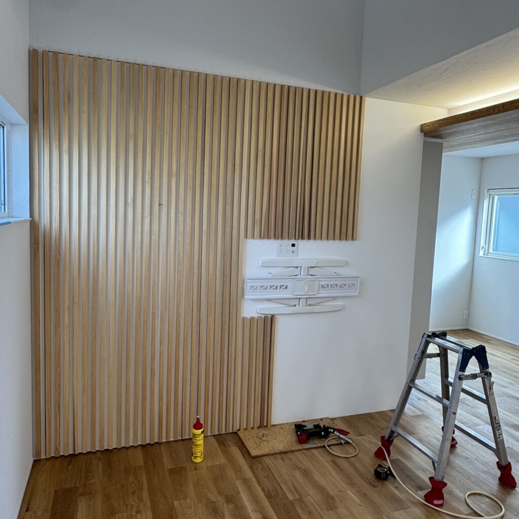 現在、岐阜市則武中にて工事中のモデルハウスにて室内に木縦格子のアクセントを設置工事をしました。