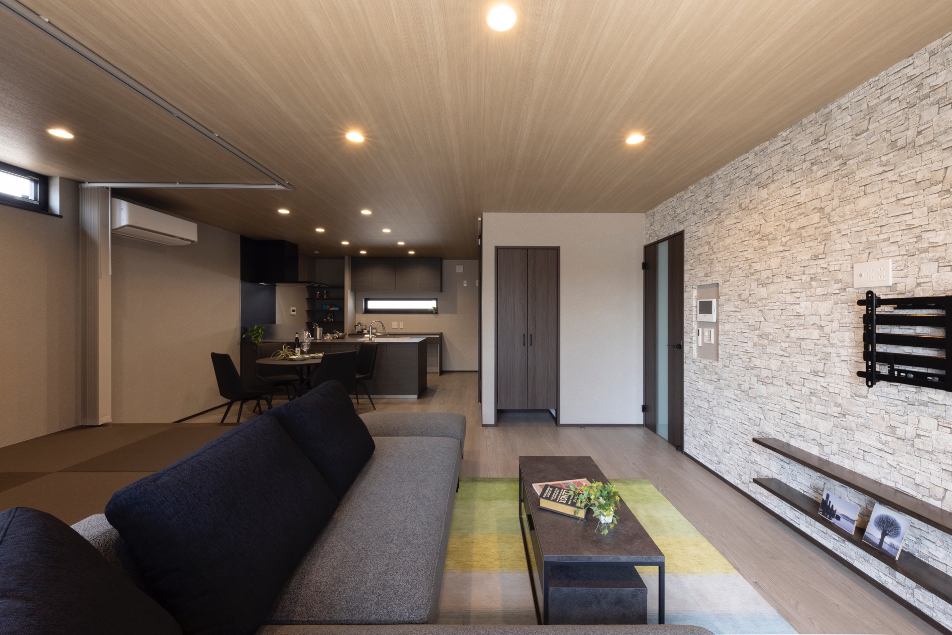 二世帯住宅だからこそ、短い家事動線とたくさんの収納が必須!1階の木目天井がとても印象的な内装も外観も上品でかっこいいお家です。