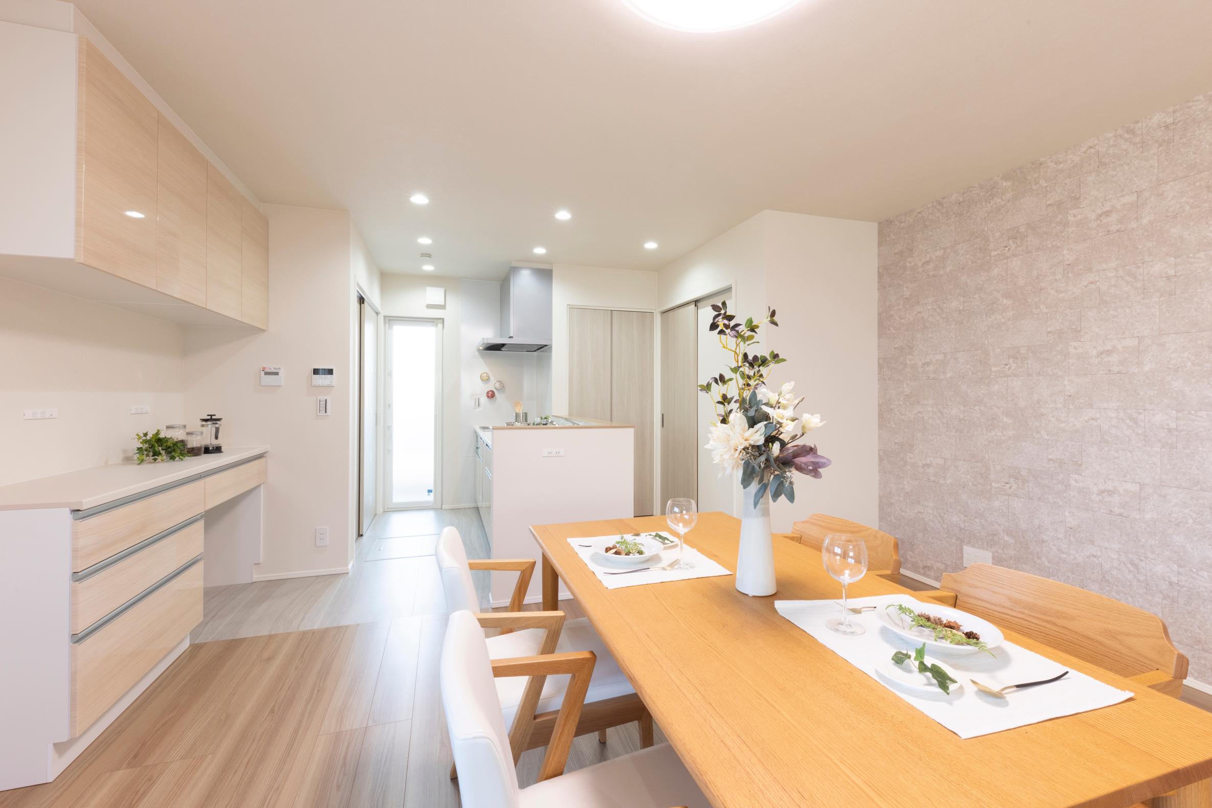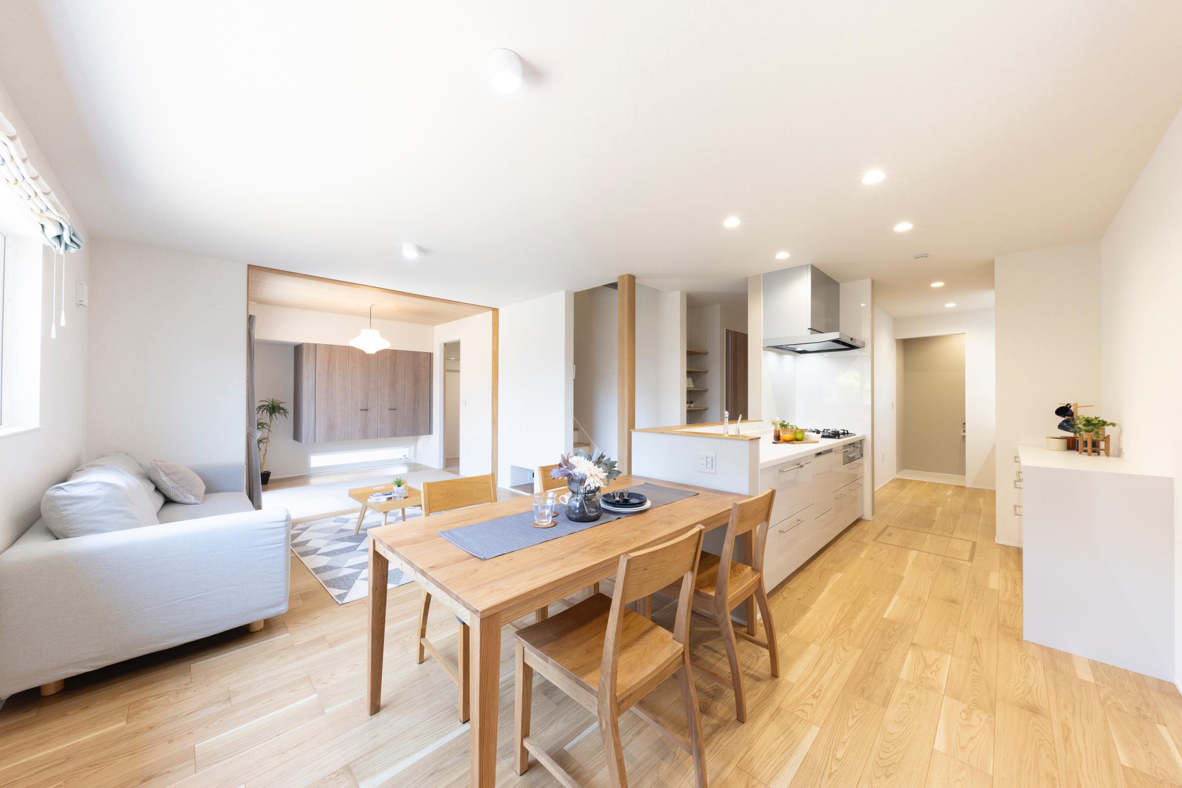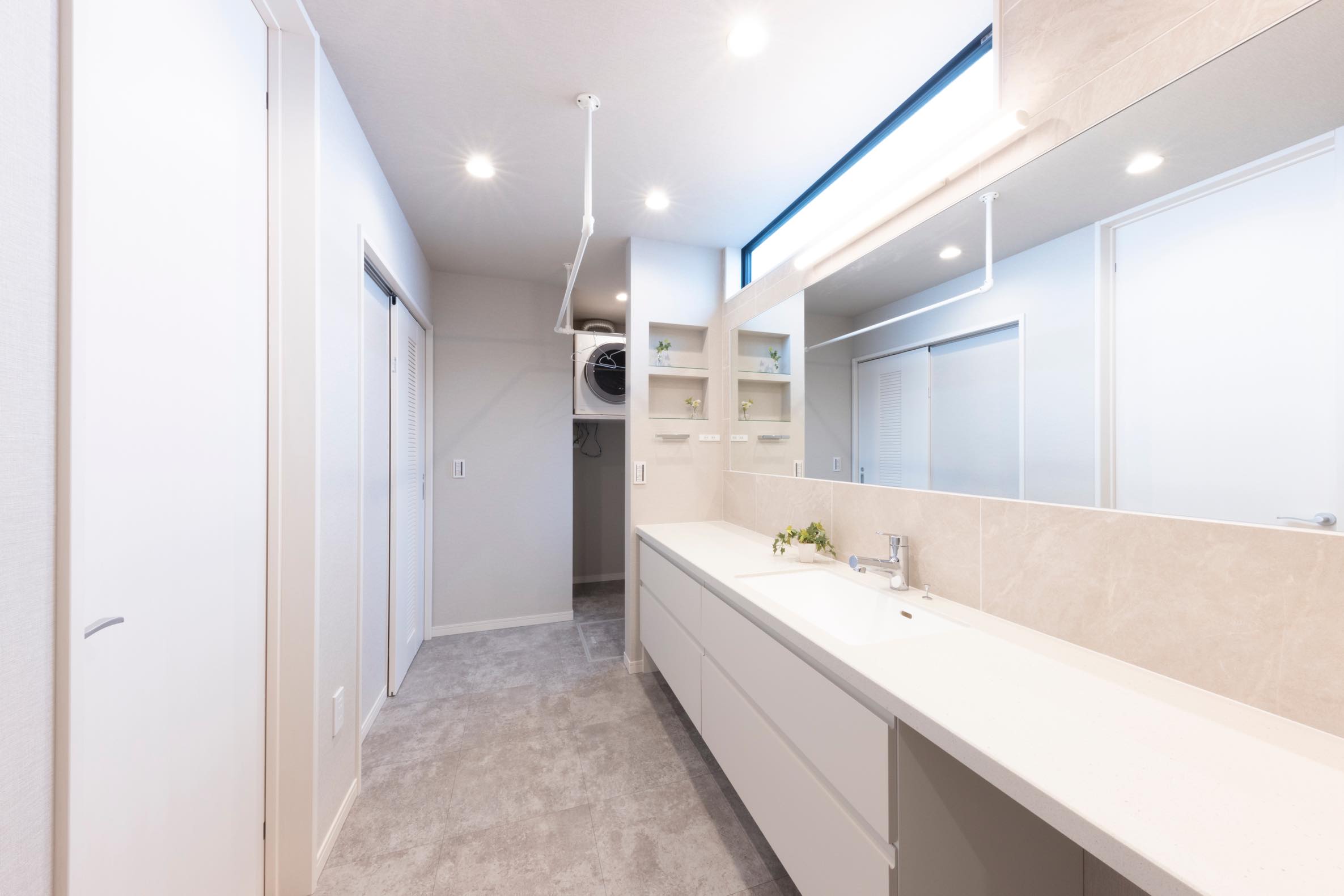 玄関からクローゼット、洗面を通ってリビングへ 。荷物も汚れも持ち込まないのでキレイを保てる帰宅動線。勾配天井の光溢れるLDKは、どこにいても家族が感じられ、会話が弾んでみんなが笑顔になる間取りのお家です。