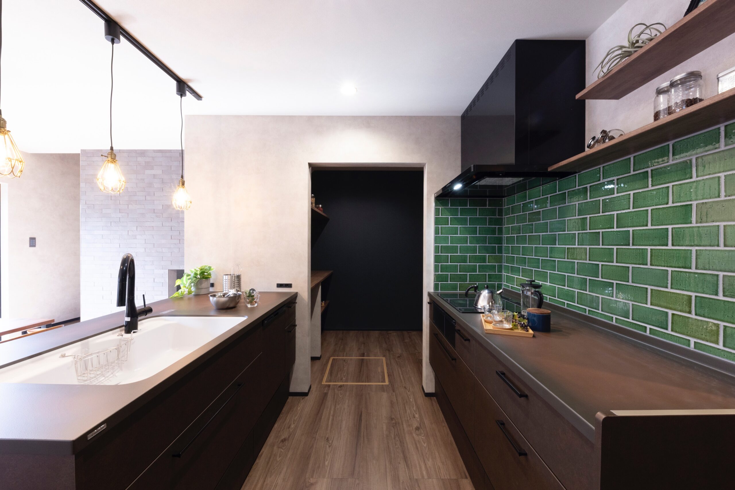 シンクとコンロが  2列に分かれたⅡ型キッチンや、洗面台は病院用の広々シンクを採用。完成前の業者さんもしっかり素通りしたパパのこもれる書斎。こだわり満載のお家です。