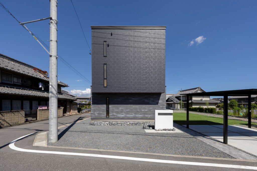 ダークネイビーのサイディングにモダンな印象のSOLIDOをアクセントに使って男前な外観。
