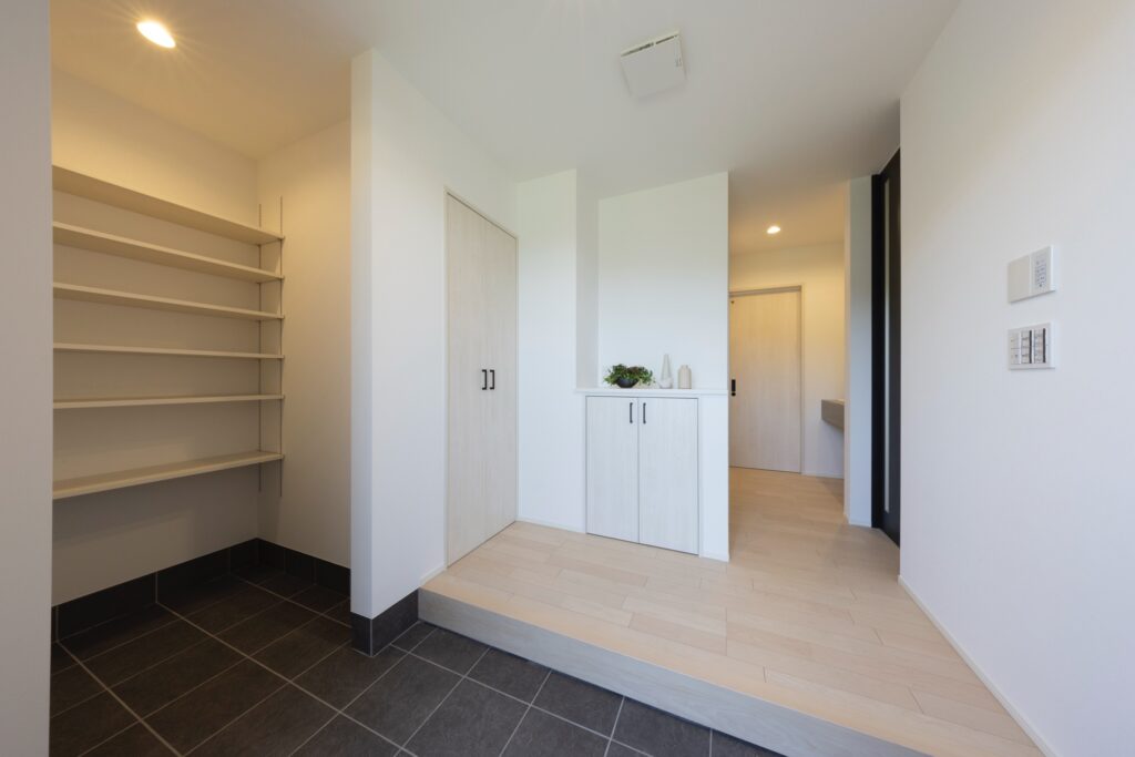 たくさんの靴もアウトドア用品もしっかり片づく玄関収納。