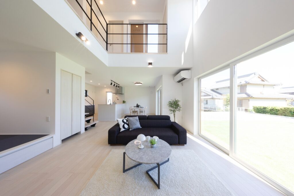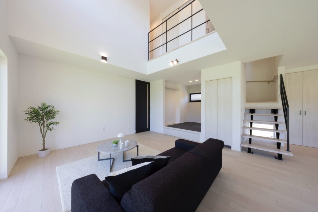 通常1階に配置する浴室・洗面ランドリーを2階に移動して広々LDKを実現。リビング横の畳コーナーやゆったりした家具配置して理想のゆとりの空間に。