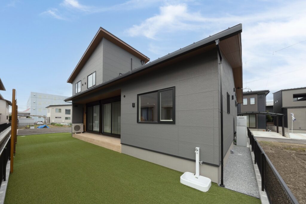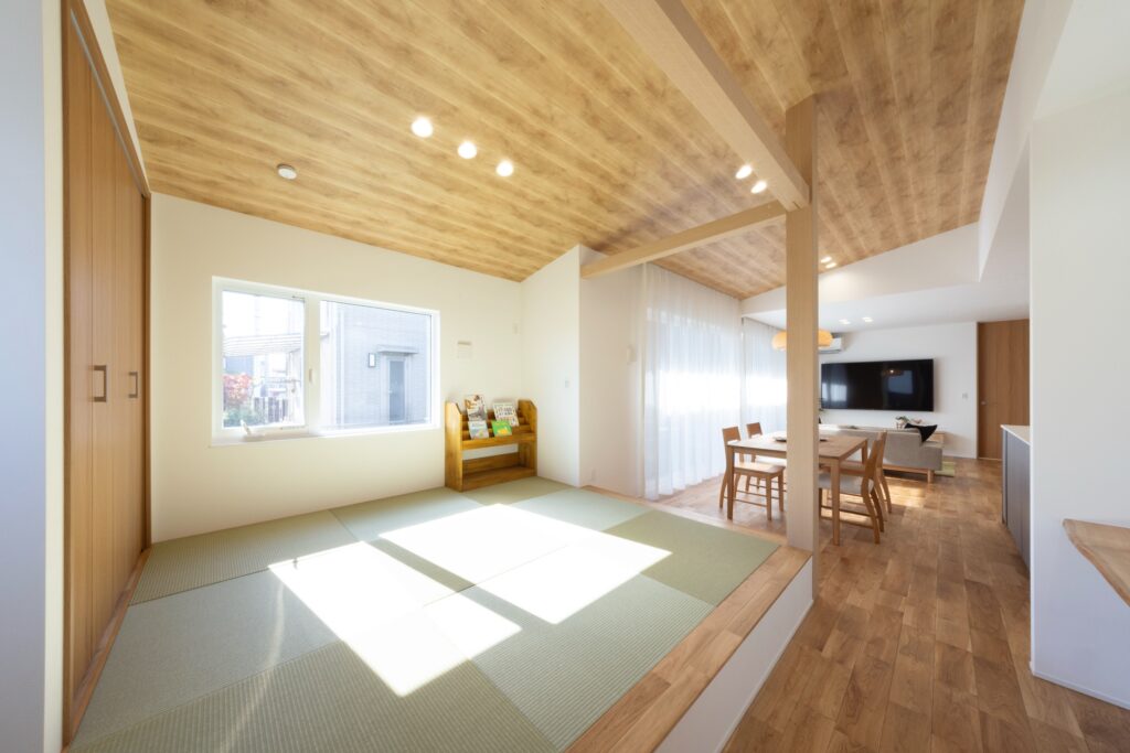 リビング横でゴロンとお昼寝したり、絵本を読んだりできるリビング和室のある 安らぎの空間があるお家です。